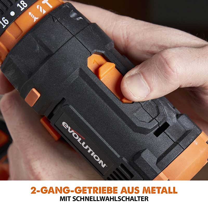 - 2-Gang-Getriebe zum Wechseln zwischen Bohr- und Schrauberfunktionen.