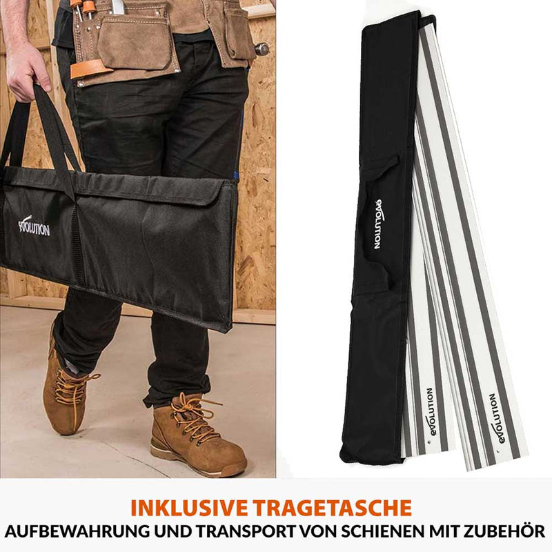 • Verlängerte Schiene und Tragetasche für Zubehör im Lieferumfang enthalten.