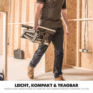 Der vielseitige und tragbare Gehrungssägenständer von Evolution ist perfekt für den Einsatz zu Hause, in der Werkstatt und auf der Baustelle. Mit einem Gewicht von nur 15,5 kg ist er leicht genug, um mit einer Hand getragen zu werden, und lässt sich dank seiner klappbaren Beine und Teleskoparme auf 1000 mm x 280 mm x 230 mm zusammenklappen.